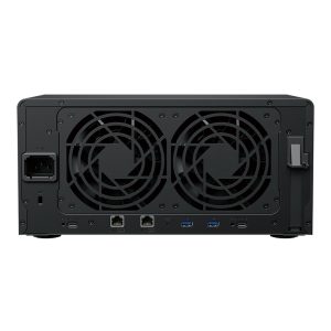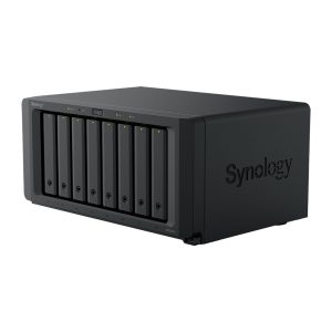 The DS1825+ features built-in 2.5GbE networking and supports both SATA SSDs and HDDs in 2.5″/3.5″ internal bays, as well as M.2 NVMe drives via M.2 slots for use as cache. Its support for expansion cards allows configuration flexibility, supporting faster networking of up to 25GbE.